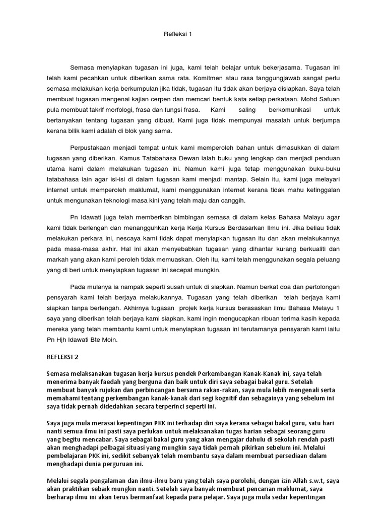 Refleksi 1 Assalamualaikum kami ucapkan bagi pembuka kata refleksi tugasan projek kerja kursus berasaskan ilmu Bahasa Melayu 1 saya. Contoh refleksidocx - PENGENALAN Assalamualaikum. Sepanjang kerja berkumpulan kerjasama amat dirasai walaupun jarang sekali berjumpa kerana semester ini masing masing banyak projek dan tugasan yang perlu disiapkan tetapi agihan tugasan dapat dilakukan dan dilaksanakan dengan baik.